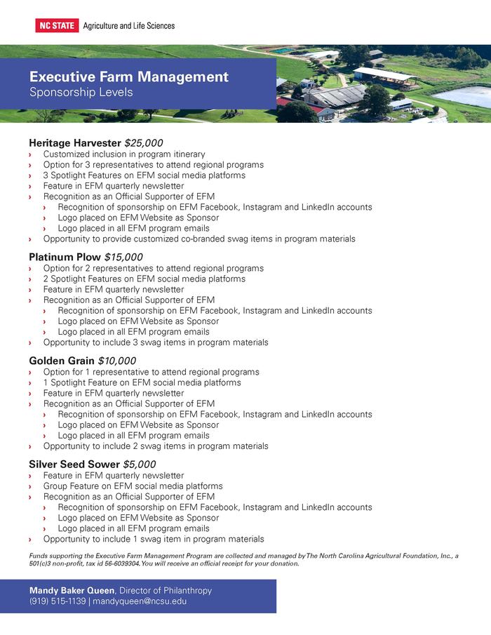 Funds supporting the Executive Farm Management Program are collected and managed by The North Carolina Agricultural Foundation, Inc., a 501(c)(3) non-profit, tax id# 56-6039940. You will receive an official receipt for your donation.